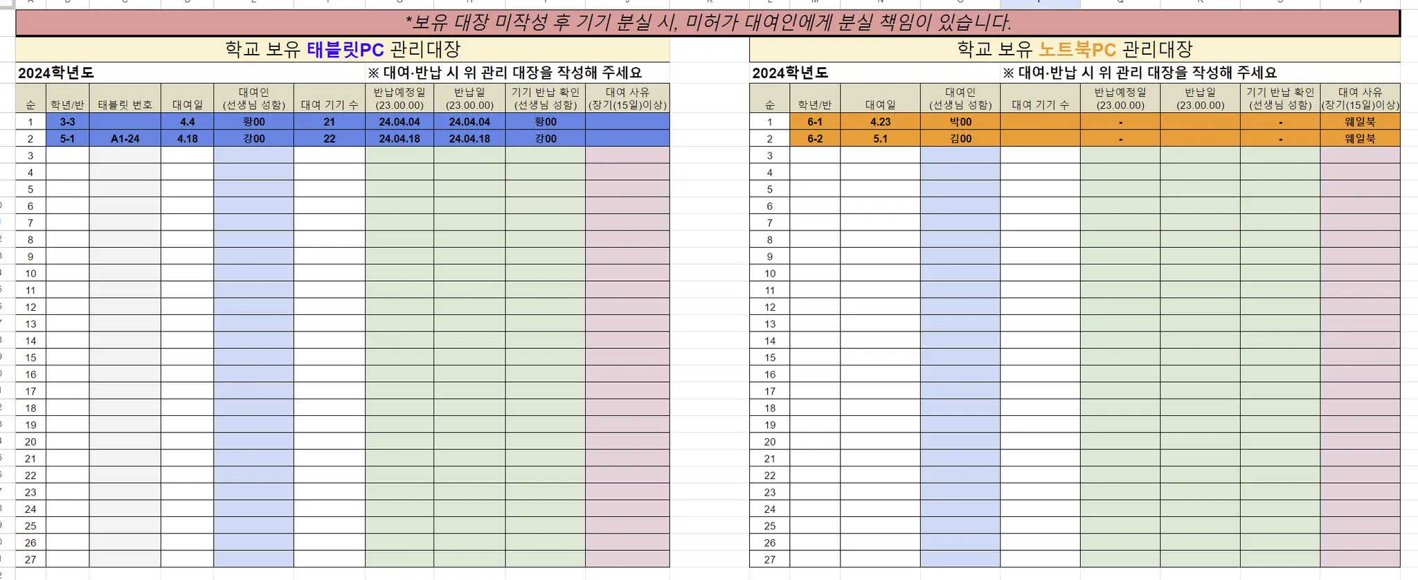 사용하고자 하는 선생님께서는 본 관리대장의 ‘편집자’권한을 받은 후, 해당 기기의 관리대장에 내용을 적어 빌려간 후, 반납 시 반납 확인까지 해주시면 됩니다.