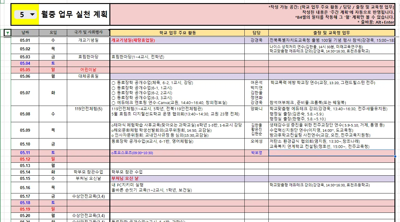 교육과정 파일 '월중행사' 복사-붙여넣기: 교육과정 파일에서 '월중행사' 부분을 복사하여 해당 시트에 붙여넣습니다.