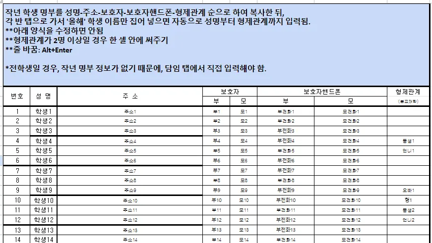 자동으로 주소, 보호자, 연락처, 비고 란이 채워지는 형식입니다.